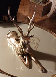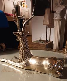 Scultura figurativa in ottone, raffigurante un cervo sdraiato, a figura intera con la testa sollevata, leggermente inclinata verso il basso, con un imponente palco di corna a sei punte con un'elegante disposizione.