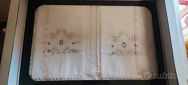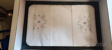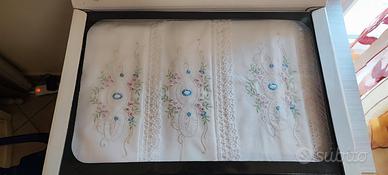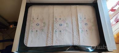 In vendita un prestigioso corredo completo da 23 pezzi, linea "Pizzo Nonna" della rinomata manifattura Vigatex. Questo set non è una comune biancheria vintage, ma un campionario esclusivo d'esposizione (Fiera del Bianco), conservato in condizioni museali all'interno della sua custodia originale. Punti di forza e Autenticità: Certificazione: Il set è accompagnato dal suo Certificato di Garanzia Vigatex originale e dal sigillo "Lavorazione a Mano", che ne attestano l'esclusività dei disegni e l'altissima qualità delle fibre. Lavorazioni di Pregio: Preziosi inserti in Pizzo Tombolo (lavorazione a fuselli) e ricami eseguiti interamente a mano a punto pieno e punto erba, con raffinati motivi floreali in tonalità pastello. Stato di Conservazione: Condizioni Pari al Nuovo (Fondo di Magazzino). Il tessuto è di un bianco candido impeccabile, privo di ingiallimenti, aloni o segni del tempo. Mai lavato, mai utilizzato, mantiene l'appretto originale di fabbrica. Composizione del Set (23 Pezzi): Il corredo è organizzato nel suo cofanetto originale a 5 scomparti e comprende: 1 Lenzuolo sopra con ampie balze ricamate e pizzo. 1 Lenzuolo sotto. 2 Federe coordinate. 6 Asciugamani in spugna/lino di alta qualità con rifiniture coordinate. 1 Tovaglia monumentale per 12 persone inclusiva di 12 tovaglioli abbinati. Specifiche per l'acquirente: Materiale: Tessuto di prima scelta (Lino/Cotone pregiato) certificato Vigatex. Packaging: Include la scatola originale blu da esposizione, fondamentale per il valore collezionistico. Utilizzo: Ideale per doti di altissimo prestigio, collezionisti di tessili antichi, allestimento di dimore storiche o come investimento nel tempo.