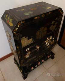 In vendita uno splendido mobiletto orientale (Cina, inizio XX secolo), un esempio raffinato di ebanisteria da esportazione. Il mobile si distingue per la sua particolare struttura a base ottagonale e per la ricchezza delle decorazioni.