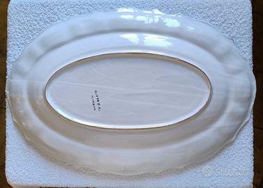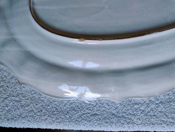Bellissimo e Rarissimo piatto da portata vintage Guerrieri di Murano lungo 49 cm largo 33 in ceramica bianca con motivi floreale verde giallo e blu, in ottime condizioni, come evidenziato sulla foto solo tre piccoli cocci sul retro ma non vedibili sul davanti.