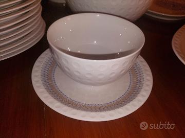 Pregiato e raro servito Arzeberg Forma 2375 Decoro 311 "Blau Gold" (blu e oro) bianco con motivo a tralci blu e dettagli dorati, detto "Golfbälle" ("Palline da golf"). Il servito è stato acquistato nel 1972 e MAI utilizzato, pertanto, essendo fuori produzione da decenni, è un oggetto da uso o collezione di rilievo. E'un'icona del design modernista creata da Heinrich Löffelhardt nel 1965 per il produttore tedesco Arzberg; la caratteristica principale è la superficie esterna, che presenta una trama a piccoli incavi circolari che imita esattamente la texture di una pallina da golf. Rappresenta perfettamente l'estetica funzionalista degli anni '60. Il servizio è stato premiato per il suo design innovativo e oggi fa parte di importanti collezioni museali dedicate al design industriale.