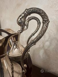 Splendida ed irripetibile coppia di decanter da collezione prodotti dalla storica distilleria Gio. Buton & C. Bologna negli anni '60. Questi oggetti non sono semplici bottiglie, ma veri e propri capolavori di alto artigianato italiano, simboli di un’epoca d’oro del design. Il set comprende: 1. Decanter Brandy "Vecchia Romagna Etichetta Nera": Caratterizzato da un distillato di vino invecchiato oltre tre anni, colore bruno intenso e profondo. 2. Decanter "Crema Cacao Buton": Un liquore pregiato dal colore ambrato dorato, estremamente scenografico. Punti di Pregio e Dettagli Esclusivi: Ogni caraffa presenta un sontuoso manico a testa di cigno finemente cesellato e basi con fregi floreali in stile barocco, il tutto con una splendida finitura argentata che dona una luce incredibile a qualsiasi mobile bar. Il corpo in vetro pesante lavorato a diamante crea riflessi spettacolari quando colpito dalla luce, esaltando il colore dei liquori originali ancora contenuti all'interno. Entrambi i pezzi conservano i SIGILLI FISCALI ORIGINALI DELL'EPOCA intatti. Questo è il dettaglio più importante per i collezionisti, poiché ne garantisce l'autenticità e l'integrità totale da oltre 50 anni. Sono presenti le iconiche targhette metalliche blu e argento appese alle catenelle originali. Le basi riportano tutte le diciture di fabbrica, la gradazione e la capacità (500cc).