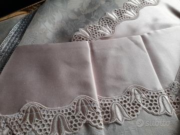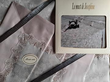 Raro Set Lenzuola Vintage Anni '80 - "Le Must de Josephine" - Misto Seta e Pizzo- Misto. 2.70x3.00 M Descrizione: Splendido ed elegante completo lenzuola originale degli anni '80, nuovo e mai utilizzato, ancora nella sua confezione di lusso dell'epoca. Un vero gioiello di biancheria per la casa firmato "Le Must de Josephine", simbolo di uno stile raffinato e senza tempo. Il set è realizzato in pregiato tessuto Misto Seta, che dona una lucentezza perlata e una morbidezza incredibile al tatto, mantenendo la freschezza e la resistenza tipiche dei corredi di una volta. Dettagli di pregio: Design: Colore rosa cipria/champagne con raffinati ricami floreali damascati tono su tono. Lavorazione: Impreziosito da un’alta balza in pizzo rebrodé finemente lavorato, presente sia sul lenzuolo che sulle federe. Condizioni: New Old Stock (NOS). Prodotto nuovo, fondo di magazzino, conservato perfettamente nella sua scatola originale integra. Stile: Perfetto per chi ama il genere Shabby Chic, il vintage autentico o per arricchire un corredo con un pezzo unico e introvabile.