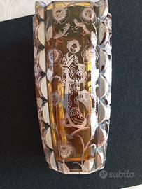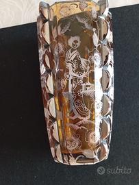 Raro Vaso Art Déco 26cm – Cristallo Ambra e Argento "Geisha" – Silver Overlay – 2,1kg DESCRIZIONE DEL PRODOTTO In vendita un pezzo da collezione di eccezionale pregio: un maestoso vaso vintage in pregiato cristallo di Boemia color ambra, caratterizzato da una rara lavorazione Silver Overlay (argento applicato) a tema orientalista. Un esempio sublime di "Giapponismo" d'epoca. Dettagli di Eccellenza: •Soggetto Artistico: L'argento sbalzato raffigura una Geisha in abiti tradizionali, circondata da una ricca composizione di fiori di ciliegio e crisantemi che avvolge l'intero perimetro del vaso. I soggetti figurativi umani sono i più rari e preziosi in questa tecnica. •Lavorazione del Cristallo: Il corpo presenta una complessa sfaccettatura laterale a "squame" o archi sovrapposti, tipica delle manifatture di lusso degli anni '20-'30 (stile Moser), che crea straordinari riflessi dorati e giochi di luce. •Stile & Epoca: Pieno periodo Art Déco Orientalista. Un oggetto d'élite che unisce il gusto europeo per il cristallo alla fascinazione per l'Oriente. •Condizioni: Ottimo stato vintage. Cristallo integro, argento con patina originale che ne certifica l'antichità. Dimensioni: •Altezza: 26,5 cm •Diametro Superiore: 15,3 cm •Diametro Inferiore (Base): 9 cm •Peso: 2.162 g INFO PER L'ACQUIRENTE •Pezzo da Investimento: Il tema figurativo e il colore ambra rendono questo vaso un pezzo molto ambito dai collezionisti di vetri d'arte. •Ritiro a Domicilio: Per garantire l'assoluta integrità di un pezzo così raro, si predilige il ritiro a mano •Pagamento: Contanti al ritiro