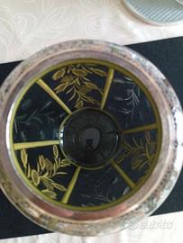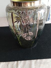 In vendita un prestigioso pezzo d'antiquariato dei primi del '900: un maestoso vaso in pregiato cristallo di Boemia color verde oliva, superbo esempio di stile Art Nouveau / Jugendstil. L'oggetto si distingue per l'imponente stazza (oltre 3,4 kg) e la rarissima lavorazione "Silver Overlay". Dettagli di Pregio e Lavorazione: · Decoro Silver Overlay: La superficie è rivestita da una ricca applicazione in argento a rilievo con motivi naturalistici di spighe di grano e corolle floreali, che si integrano con incisioni artistiche a ruota direttamente sul cristallo. · Bordo "Lace Design": L'imboccatura superiore è interamente rifinita da una fascia d'argento lavorata con un rarissimo motivo a "merletto" (pizzo), tipico delle manifatture di lusso europee d’epoca. · Materiale: Cristallo soffiato color verde oliva (probabile vetro all'uranio/vaseline glass), caratterizzato da una trasparenza profonda e riflessi straordinari. · Dimensioni Monumentali: Un pezzo da esposizione importante con un'altezza di 31 cm e una circonferenza massima di 71 cm. Dati Tecnici: · Altezza: 31 cm Circonferenza Massima: 71 cm · Peso: 3.467 g · Condizioni: Eccellente stato conservativo vintage. Il cristallo è integro, senza sbeccature. L'argento conserva la sua patina originale che ne garantisce l'autenticità. CONDIZIONI DI VENDITA · Prezzo: 480,00 € (Valutazione basata su rarità, peso e stile Art Nouveau). · Ritiro a Domicilio: Data l'estrema fragilità, il valore storico e il peso elevato dell'oggetto, si richiede esclusivamente il ritiro a mano a domicilio · Visto e Piaciuto: L'acquirente potrà visionare e verificare l'integrità del vaso al momento dello scambio. · Pagamento: Contanti al ritiro