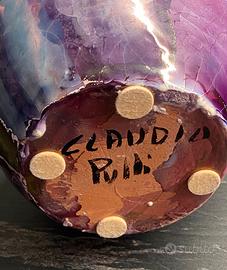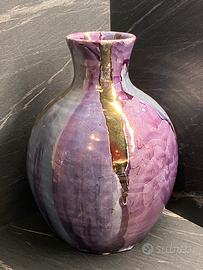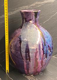 Splendido e autentico vaso in ceramica artistica realizzato dal maestro Claudio Pulli (membro della storica dinastia di ceramisti Pulli di Selargius, Sardegna). Un pezzo da collezione che incarna la sua ricerca tecnica e formale. • Autore: Claudio Pulli (Firma incisa a mano sulla base, ben leggibile). • Stile e Tecnica: Una superba interpretazione della tecnica Raku con fortissimi influssi informali e materici. Il vaso presenta una base cromatica complessa tra il viola melanzana, il prugna e l'indaco, interamente percorsa dal caratteristico craquelé (cavillatura) della smaltatura Raku. La caratteristica saliente sono le audaci colature verticali in smalto metallico color oro/bronzo antico, che creano un contrasto materico e cromatico drammatico, quasi una fusione minerale sulla superficie. L'effetto è opulento e al contempo grezzo, tipico della visione di Pulli. Non è un semplice oggetto decorativo, ma un'opera d'arte ceramica italiana del secondo Novecento. Un must-have per collezionisti di ceramica sarda (scuola di Lenci, C.A.S., etc.) e amanti del design d'autore. #claudiopulli #ceramicasarda #ceramicadautore #artpottery #raku #ceramicart #fattoamano #madeinitaly #collezionismo #interiordesign #ceramicapulli #sardiniaart #novecentoitaliano #designstorico #pezzo-unico