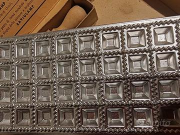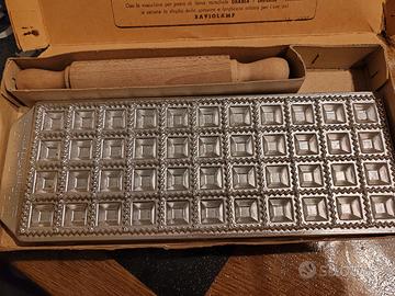 Raviolamp stampi per tortellini con scatola cartone vintage segnata dal tempo danneggiata stampi alluminio e mattarello legno nuovi