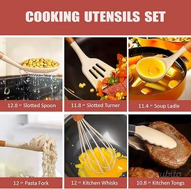 【Ambientale e sicuro】Questo set di utensili da cucina è realizzato in acciaio inossidabile e silicone di alta qualità. Il silicone alimentare è molto sicuro in qualsiasi cibo. Non reagisce con alimenti o bevande e non produce fumi nocivi. È atossico, inodore, non corrosivo e durevole. Il silicone di alta qualità può resistere a temperature da 230℃ a 250℃ o 446℉-482℉.