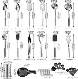 Set di utensili da cucina da 39 pezzi inclusi: 1 mestolo, 1 schiumarola, 1 spatola scanalata, 1 paletta per pasta, 1 cucchiaio da cucina, 1 schiacciapatate, 1 frusta per uova, 1 cucchiaio scanalato, 1 pinza da cucina, 1 spatola piatta, 1 spatola flessibile, 1 pennello per imbastire, 1 poggiamestolo, 1 portautensili, 5 misurini, 14 ganci appesi. possono soddisfare tutte le tue attività di cucina.