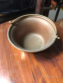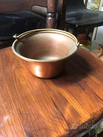 Splendido pezzo d’epoca, unico nel suo genere, realizzato in rame martellato con manico in ferro pieno fissato con borchie. Interno con patina verde naturale dovuta all’ossidazione, che ne testimonia l’autenticità e l’età.