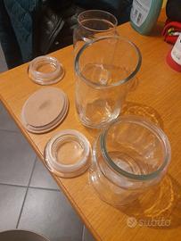 n3 recipienti in vetro con coperchio di chiusura. 2 hanno la chiusura con tappo in vetro e 1 con tappo in legno. Tutti e 3 a 10 euro