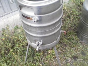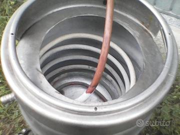 In AISI 304, adatti ad alimenti.Tappo a vite modificato con avvitato un termometro a lancetta e una presa per far uscire il vapore.Probabilmente sono un abbozzo per costruire un piccolo impianto di distillazione.Ha un gemello di recipiente modificato per ottenere un condensatore.Il condensatore è evidenziato nelle ultime tre foto.Il secondo oggetto costa meno, 20 euro.