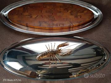 Una magnifica aragostiera, adatta per servire anche altre pietanze, realizzata in Italia negli anni ‘80. Ottimamente conservata, con il suo tagliere interno in legno intarsiato, è un oggetto di grande eleganza, magnifico da tenere esposto, proprio per la sua fattura. Marchiato Silver Plate, risulta un dono di grande eleganza.