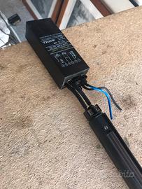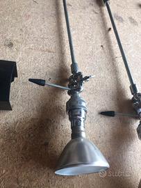 Tre faretti a binario della Disegno Luce by Reggiani degli anni 90. Nonostante l’etá sono in buono stato con i classici segni del tempo. La corsia misura 180 cm e con il trasformatore arriva a 2 mt. Mentre i faretti hanno un’altezza di 37 cm