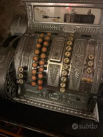 Affascinante registratore di cassa antico NATIONAL originale dei primi del Novecento, in metallo nichelato con ricche decorazioni floreali in stile Art Nouveau. Modello meccanico a manovella, perfettamente funzionante, dotato di tastiera a colonne e cassetto portamonete originale in legno.