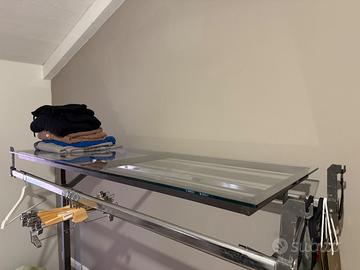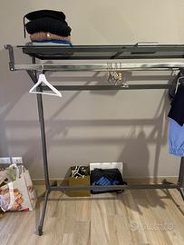 Rella di produzione artigianale in ferro battuto fatta su misura per un negozio. Utilizzabile come armadio: offre due aste utilizzabili ed un’ampia lastra di appoggio in cristallo (7 mm).