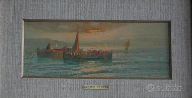 Dipinti italiani della metà del XX secolo. Opere d'arte olio su tela, incollata su cartone, raffigurante Paesaggio marino con barche e scena campestre, in stile impressionista, di buona qualità pittorica. Quadri di dimensioni limitate. Opere caratterizzate da colori caldi e da un sapiente uso della prospettiva. Dipinto senza autenticazione. Quadri facente parte di una coppia ma vendibili anche singolarmente, (chiedere per il prezzo). In buone condizioni con alcuni piccoli segni del tempo.