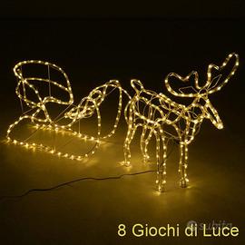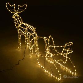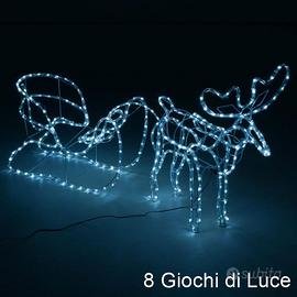 Il tubo luminoso è dotato di ben 504 led a luce bianca calda o fredda ed è già fissato al telaio della renne e della slitta, telaio realizzato in metallo verniciato bianco in modo da confondersi ancora meglio con l'ambiente Natalizio possibilmente innevato.