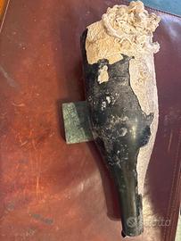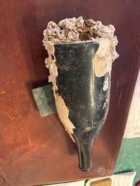 •Caratteristiche: Il collo della bottiglia presenta ancora il vetro scuro originale, mentre la parte inferiore è densamente ricoperta dalle concrezioni.