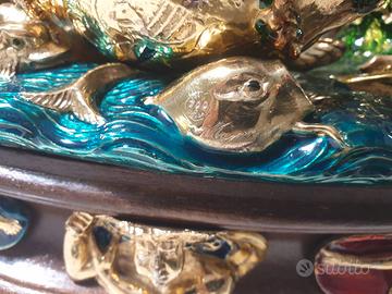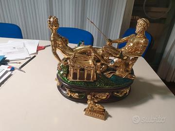 Splendida replica a grandezza naturale della Saliera d’oro di Benvenuto Cellini. La magnifica opera si presenta in parte dorata e in parte colorata con smalti a fuoco, mentre il basamento è in legno. Ottime condizioni, brilla tutta! L’opera, facsimile introvabile, è stata prodotta dall’argenteria Morpier di Firenze (no Fiorentini, no Vallè, no Arval). Prezzo trattabile €6.500. Primo contatto via Subito o via whatsapp n. 34zero1zero961zero2. Eventuale spedizione concordabile. Piccolissime bruniture.
