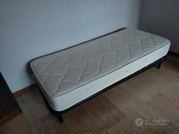 Rete con doghe in legno completo di materasso singolo. Misura rete: cm 190 l x 47 h x 85 p, materasso h 22cm.