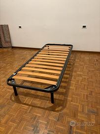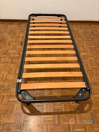 Vendo rete letto singolo a doghe in legno, con struttura in metallo verniciato nero e gambe avvitate. Solida, leggera e facile da trasportare.