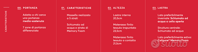 Causa errata valutazione delle misure, vendo in unico lotto rete a doghe, materasso e topper nuovi, misure cm. 200 x 100. Premetto che si tratta di prodotti top di gamma, realizzati artigianalmente e destinati a chi pretende il massimo per qualità e comfort: Rete total wood a 18 doghe. Materasso Brentaflex mod. “Top Italy” prodotto premium della linea Foam Memory, composto da lastra multistrato a diverse densità con sostegno adattabile ed equilibrato, memory foam con strato superficiale in Calipore®, per un comfort ineguagliabile e perfetta aerazione del materasso. Rivestimento realizzato con fibre di bamboo, autentico antiacaro naturale con eccellente azione traspirante. La fibra di bamboo assorbe e disperde gli odori e i gas inquinanti, previene la formazione di muffe e contrasta la proliferazione di microorganismi allergici. Contenendo la pectina del miele, ha proprietà emollienti, nutrienti e rigeneranti per la pelle ed è dotato di una soffice imbottitura in poly bamboo anallergico. Lato invernale e lato estivo offrono comfort climatico e benessere totale in ogni stagione. Cerniere su 4 lati, maniglie, fascia 3D traspirante, lavaggio a 40°. Il topper, sempre premium made in Italy è ignifugo. Ripeto, nuovo e pagato il doppio del prezzo di vendita.