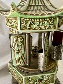 Carillon Reuge portasigarette a pagoda in maiolica decorata e rifiniture in metallo argentato anni 20 o 30.
