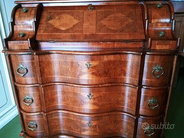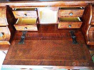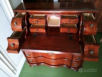 La calatoia frontale cela al suo interno un piano scrittura ,4 cassettini e vanno a giorno ,serratura funzionante con chiave + 4 PARTICOLARISSIMI CASSETTI ALLUNGATI IN PROFONDITA' .