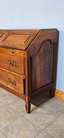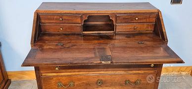 Splendida ribalta a due cassetti leggermente mossi e calatoia a scrittoio con quattro cassettini interni a scalare e vano a giorno al centro