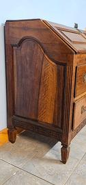 Splendida ribalta a due cassetti leggermente mossi e calatoia a scrittoio con quattro cassettini interni a scalare e vano a giorno al centro