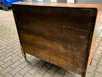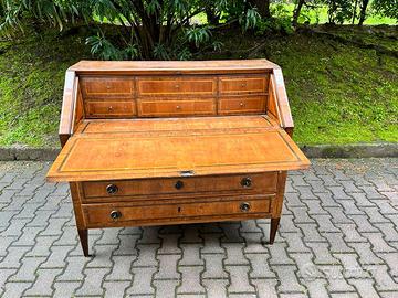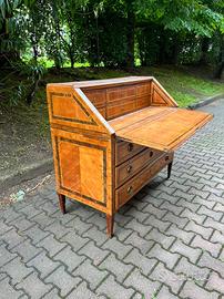 Antico cassettone a ribalta neoclassico, fine 700, intarsi in vari legni, cassetti in battuta, autentica in ogni sua parte, una gamba posteriore da incollare vedi foto e piccoli restauri da fare. Molto elegante. Parte interna con sei cassettini intarsiato e vari segreti. Spedizione o ritiro da concordare