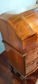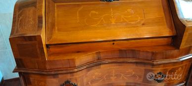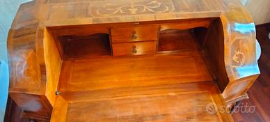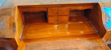 Ribaltina con intarsi in legno a 2 cassetti misure: lunghezza.87cm. prof. 38 cm. alt. 87 cm. misura con anta aperta 56 cm. Da ritirare in loco.