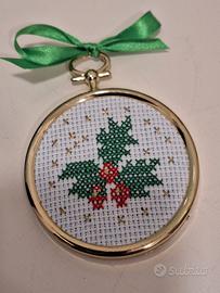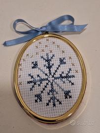 Ribasso- Set n. 2 cornici plastica dorata con ricamo a mano su tela Aida. Ovale cm. 9x7, tonda cm.7x7. Addobbo natalizio