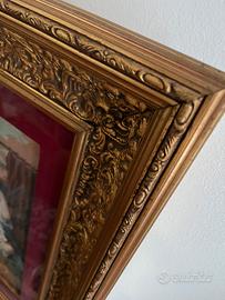 Ricamo figurativo a mezzo punto rappresentante la "Madonna dell'uva"di Pierre Mignard. Misura: 66 x 76, di cui arazzo interno ricamato 36 x 45. Cornice importante e decorativa, con struttura in legno dorata con motivi ornamentali in rilievo, vetro protettivo e passepartout interno che separa il ricamo valorizzandone la tessitura.