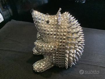 Di buon auspicio, questo simpatico Riccio leggerissimo, realizzato in polistirolo, interamente ricoperto da borchiette argentate.