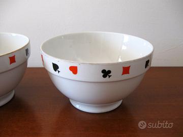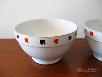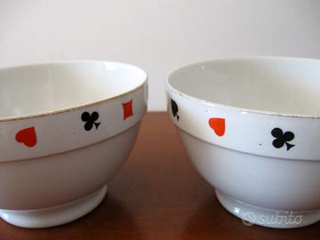 Vendesi n°2 ciotole Richard-Ginori in porcellana decorate nella fascia superiore con i simboli delle carte da gioco: cuori,quadri,fiori,picche rifinite sull' orlo da un filo color oro. Marchio di produzione sotto la base di ogni ciotola. Misure: Diametro base= 8cm Altezza=8,5cm Diametro superiore=15cm Condizioni: oggetti USATI in buone condizioni: è presente qualche segno d'uso e del tempo, segnalo mancanze sul filo color oro superiore. Disponibile per altre informazioni o fotografie. Eventuale spedizione con codice tracciabilità.