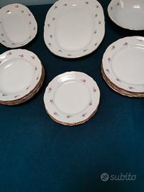 Richard Ginori, servizio di 21 pezzi in ottime condizioni privo mancanze o rotture. Presenti sei piatti per tipo più due vassoi e una insalatiera. Qualche consumo della doratura sui bordi comunque ben presente. Disegno tipo antico doccia in versione precedente. Produzione fine anni 50 in porcellana Ariston.