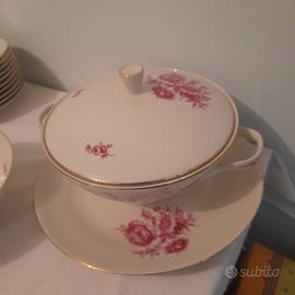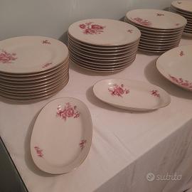 RICHARD GINORI SERVIZIO DI PIATTI DA 10 PERSONE CON FIORI ROSA E FILO D'ORO, 47 pz. , anni '70 del 900.