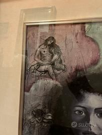 - L’opera raffigura un volto femminile intenso e realistico, circondato da piccole scene narrative, queste apparizioni sembrano emergere come ricordi, frammenti di esperienze vissute, sogni o stati d’animo.