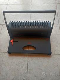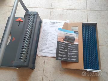 rilegatrice a spirale formato A4. fornita con imballo originale e una confezione di morsetti plastici a spirale di colore blu, diametro circa 1cm.