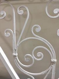 Ringhiera per scala in ferro battuto lavorato a mano. Molto bella, robusta e in ottimo stato, tinteggiata colore bianco lattel, comprensiva di corrimano in legno chiaro. lunghezza corrimano 1.82 cm altezza da gradino 1.10 cm È da visionare e ritirare in loco.