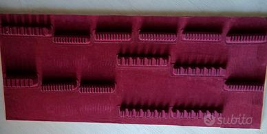 Ripiano in legno rivestito da un lato con carta di Varese e dall'altro con un organizzatore per 168 posate in feltro colore bordeaux (n.14 supporti ciascuno per 12 posate). Lunghezza ripiano 96 cm X 40 cm di profondità.