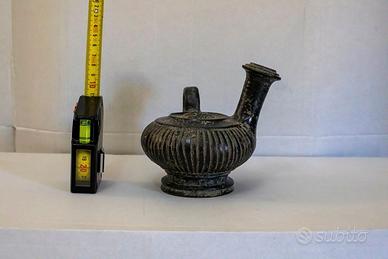 Vendo riproduzione artistica di Guttus Etrusco in terracotta n. 20 Guttus con decorazione impressa, modellato a tornio e a stampo. Dotato di piede cilindrico, corpo globulare appiattito decorato con striature mediamente profonde disposte a file parallele ad andamento verticale. Il bocchello, dotato di alto collo, è caratterizzato da un orlo estroflesso scanalato e ansa ad anello. Riporta una scena figurata a rilievo sulla superficie superiore del corpo che consiste in una scena di combattimento tra un grifone alato e un altro animale., questi vasi venivano prodotti in Etruria dal IV al III secolo a. C. circa. Fatta a mano, pezzi unici diversi uno dall'altro.