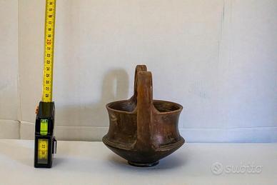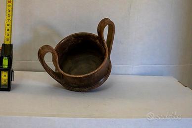 Vendo riproduzione artistica di Kantaros Etrusco di impasto n. 17 marrone con due manici e decorazioni impresse a metà vaso, questi vasi venivano prodotti in etruria dalla nel VII secolo a. C. circa. Fatte a mano con cottura speciale per dare il colore nero, pezzi unici diversi uno dall'altro.