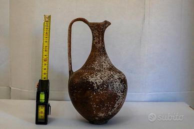 Vendo riproduzione artistica di Oinochoe Etrusco in impasto n. 23 con graffiti. Dotato di piede cilindrico, corpo allungato, questi vasi erano usati per versare il vino e venivano prodotti in Etruria dal VII al VI secolo a. C. circa. Fatto e inciso a mano, pezzi unici diversi uno dall'altro.