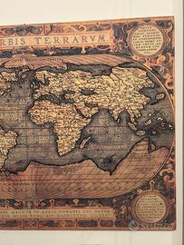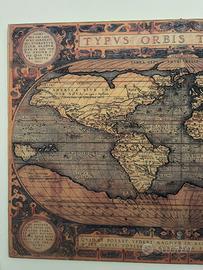 La mappa 120 x 83 cm mostrata è una riproduzione del "Typus Orbis Terrarum" di Abraham Ortelius. Pubblicata per la prima volta nel 1570, questa mappa storica è la carta del mondo che compare nel primo atlante moderno, il Theatrum Orbis Terrarum.