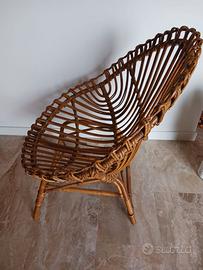 Poltrona a conchiglia in rattan e vimini. Anni 50/60. Unico difetto un pezzo di canna rotto come da foto che però non ne compromette l'estetica né la funzionalità. Ritiro a Milano