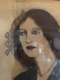 Vendo splendido quadro con cornice, pezzo unico che rappresenta una figura femminile con un mantello rosso. L'opera è realizzata con una tecnica mista su tela, caratterizzata da colori caldi e dettagli geometrici che la rendono un'aggiunta di grande stile a qualsiasi ambiente.