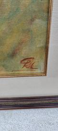 Ritratto di giovane donna — Olio su tela, monogrammato, Italia anni '50–'70 Ritratto a mezzo busto di giovane donna con capelli castani raccolti e occhi verdi, eseguito con pennellata sciolta e luminosa su tela. La tavolozza calda di ocra, verdi e beige crea un'atmosfera intima e delicata. Monogramma rosso in basso a destra. Tecnica: olio su tela Cornice: legno scuro intagliato con filetto dorato e passepartout in tessuto Dimensioni indicative: circa 25×30 cm (opera), 45×55 cm (con cornice) Condizioni: buone Opera di piacevole fattura, adatta a un arredo classico o vintage. prezzo trattabile